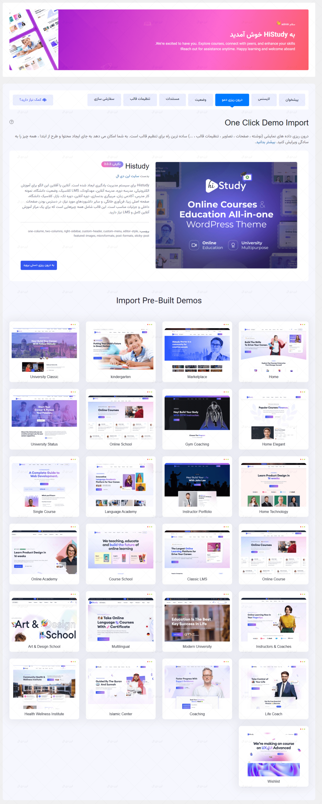 قالب وردپرس آموزشی HiStudy | ساخت پلتفرم آموزش آنلاین با امکانات پیشرفته یک راهکار جامع و حرفه‌ای برای ایجاد وب‌سایت‌های آموزشی در وردپرس است. این قالب با طراحی مدرن و امکانات گسترده، مناسب برای دانشگاه‌ها، مؤسسات آموزشی، مدرسان و فروشگاه‌های دوره‌های آنلاین می‌باشد.